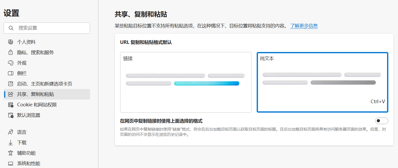 研究了下,解决方法很简单,进入edge的设置,选择左侧:共享、复制和粘贴,然后把“URL 复制和粘贴格式默认”设置为“纯文本”就可以了!